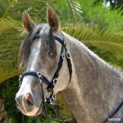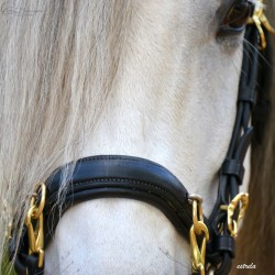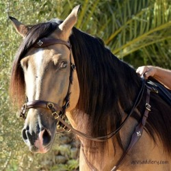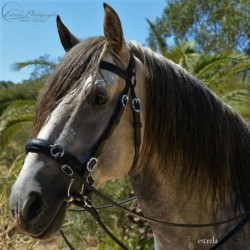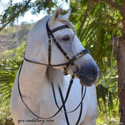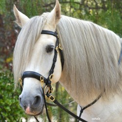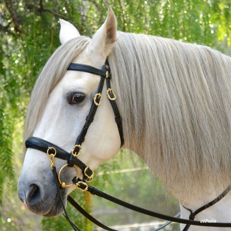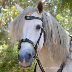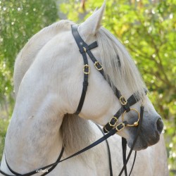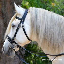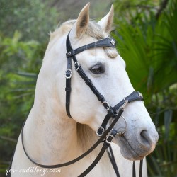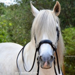 Hand crafted Academic bridle with Semi Cavesson (rigid noseband) with 2 rings for attaching the nosereins. Other than the Spanish serreta nose iron this semi cavesson has a smooth, flat steel bar inside that can be formed towards your horses nose and is softly padded.